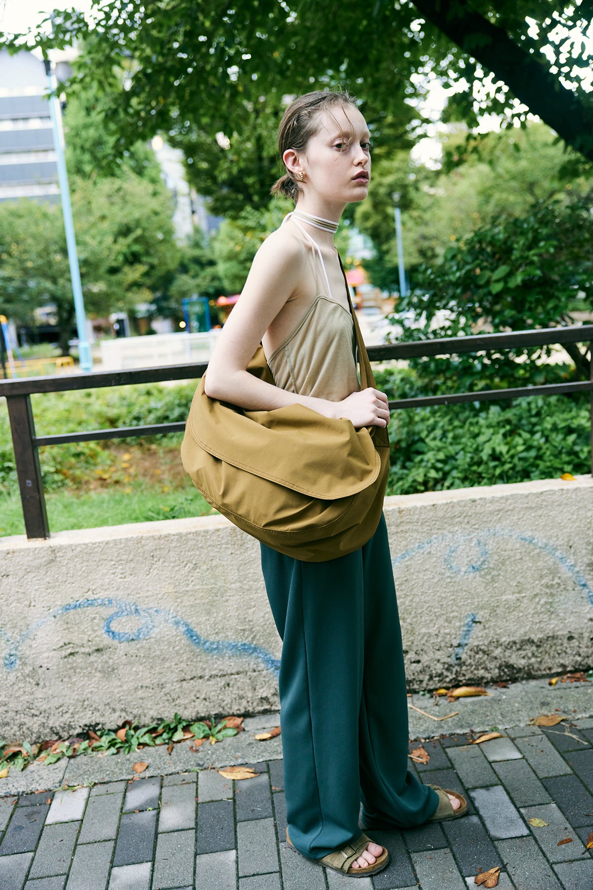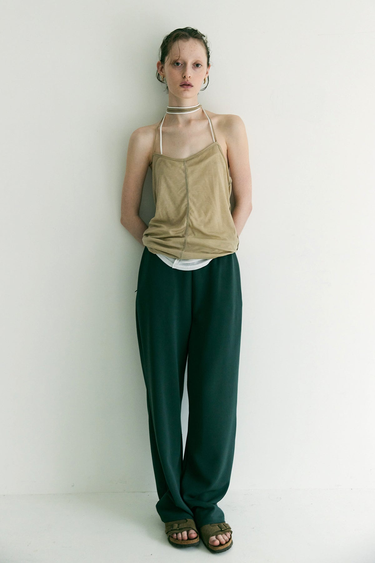 一見シンプルに見えるデザインは随所にステッチワークと細かなギミックがアクセントに。肩紐はチョーカーのように首に巻きつけるスタイルで自由な感覚でスタイリングにプラスワンしていただきたい一枚です。