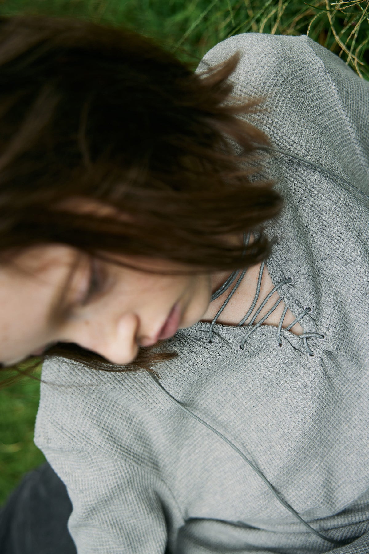 レースアップのキーホールネックがポイントのサーマルカットソー。