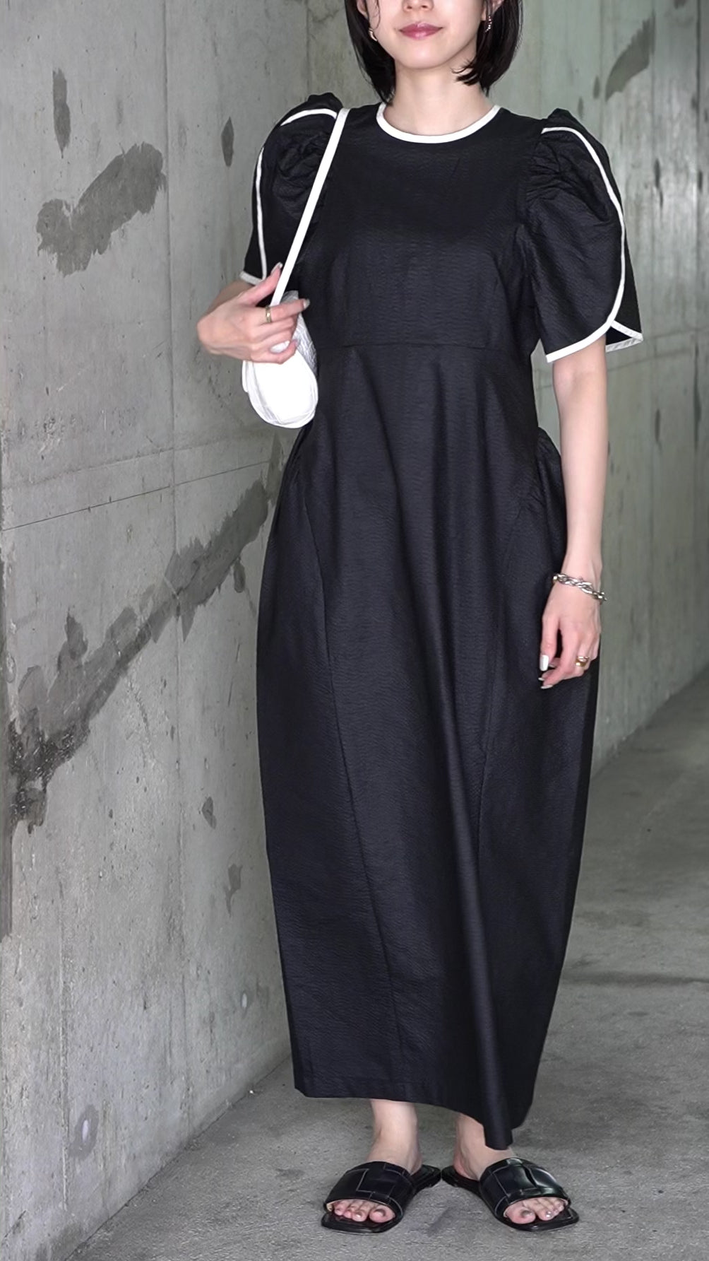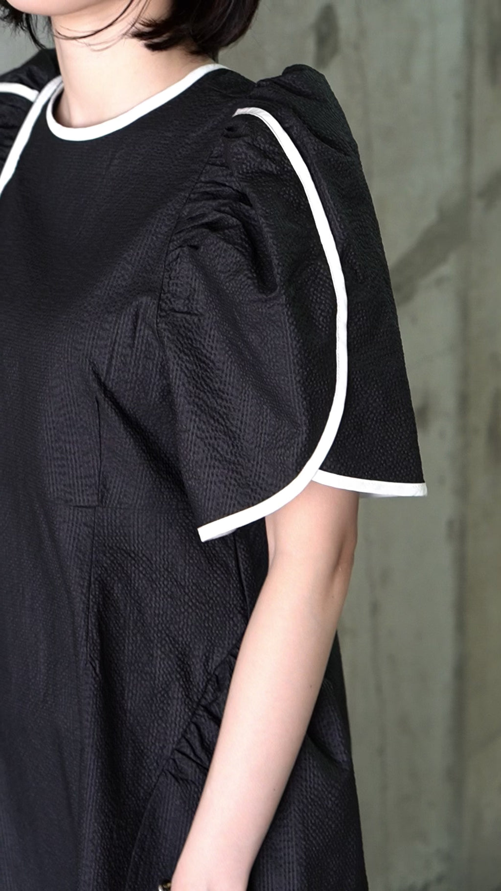 蕾のような重なりが特徴的なパフスリーブとコントラストの効いたパイピングのしなやかなラインが可憐でいてモードなイメージ。