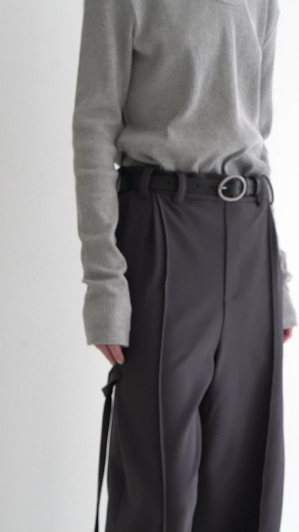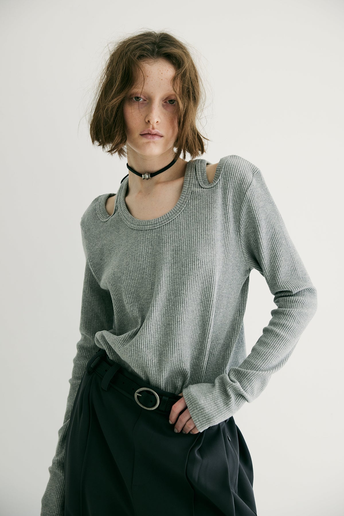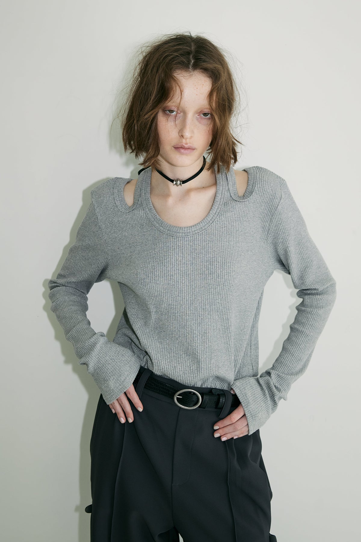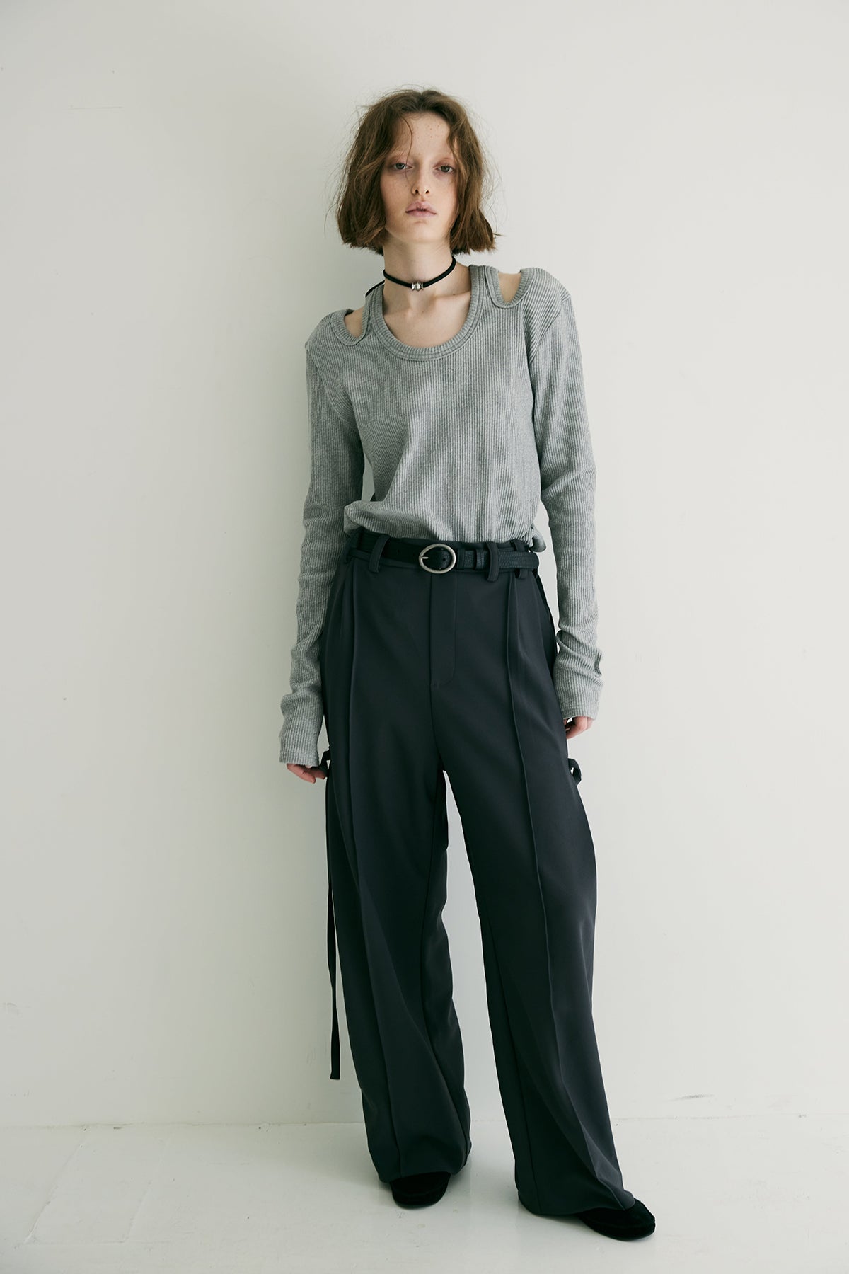 ほどよくコンパクトなシルエットに、モードな肌見せをプラスすることで、シンプルながらも印象的なスタイルを演出。