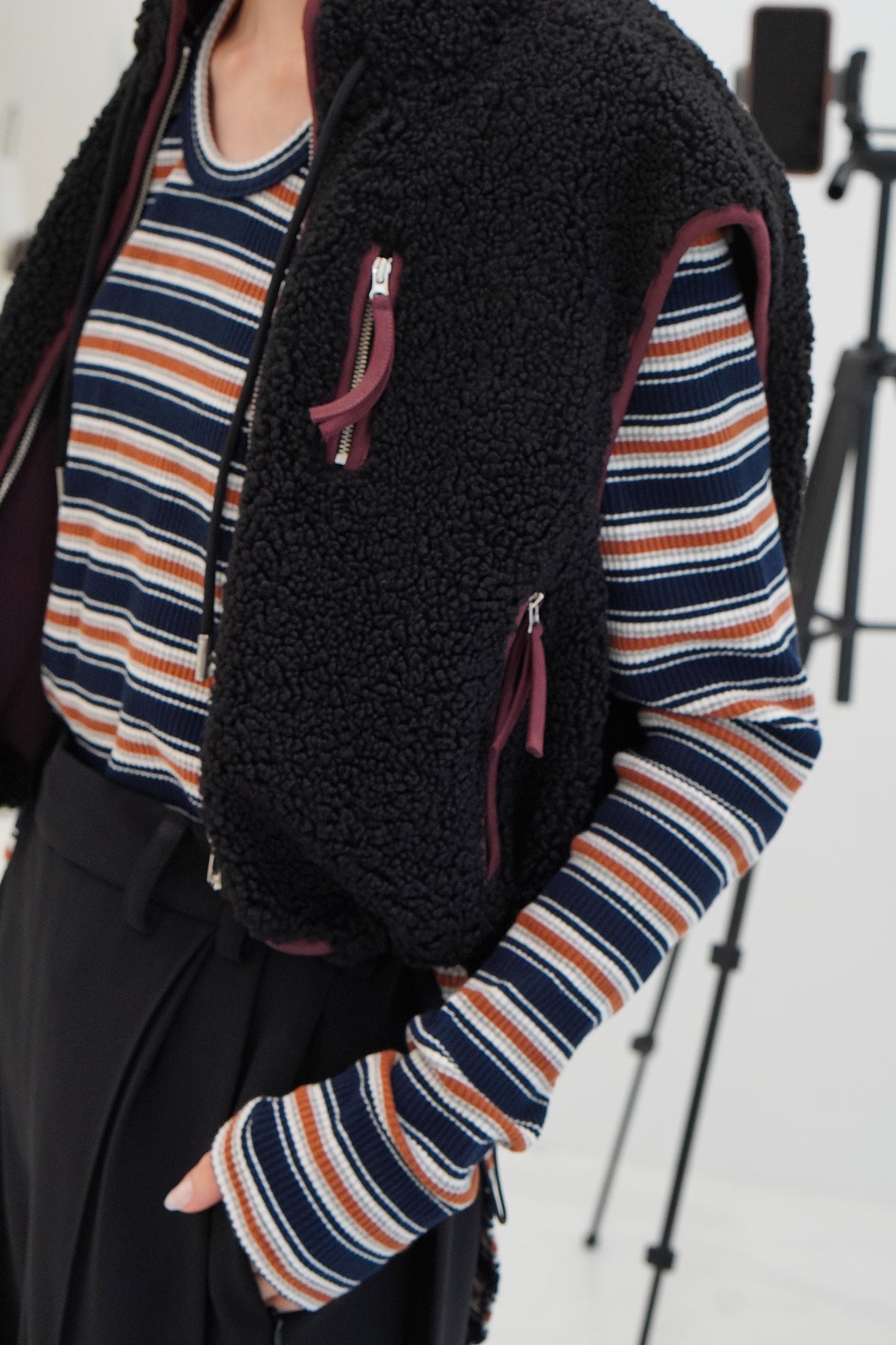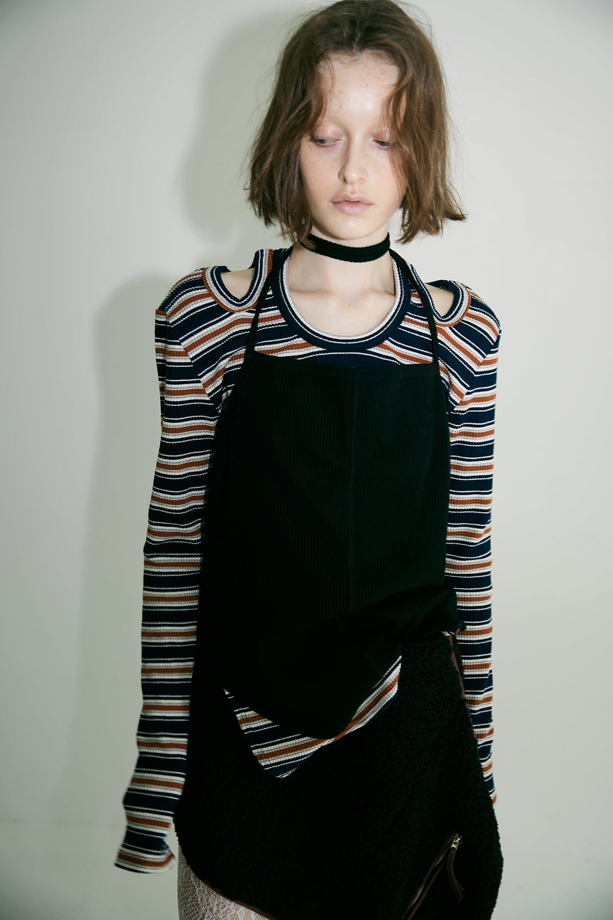 ほどよくコンパクトなシルエットに、モードな肌見せをプラスすることで、シンプルながらも印象的なスタイルを演出。