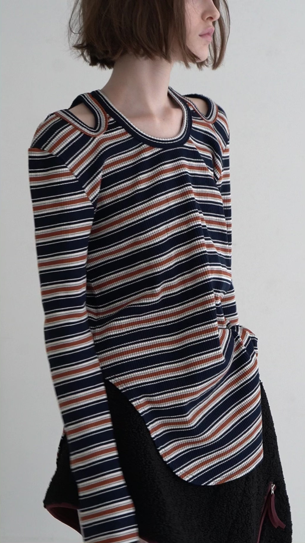 ボールドなフライスで縁取ったショルダーホールが目を引く、洗練されたデザインのリブカットソー。