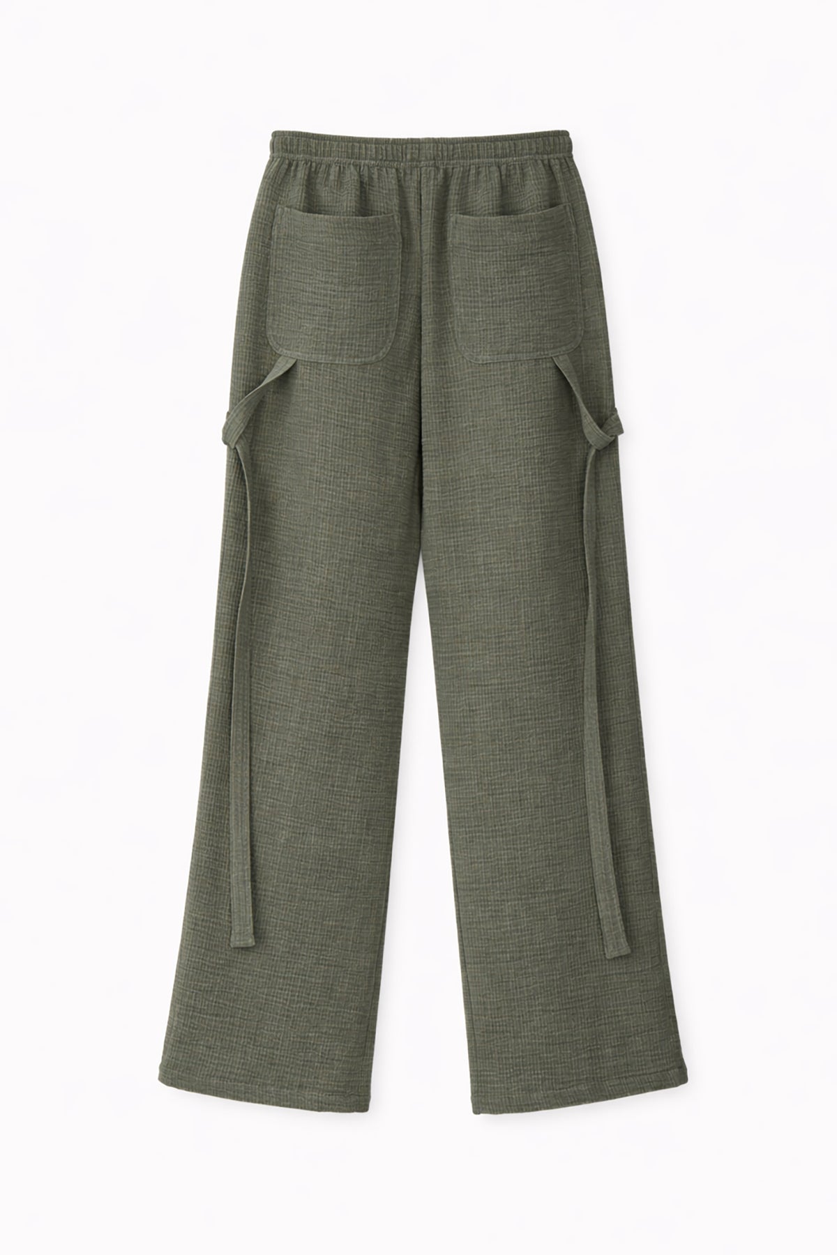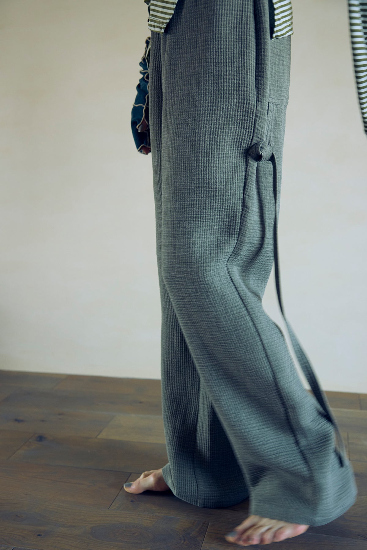 ウエストはギャザーゴム仕様の内紐タイプで、フィット感の調整が可能。