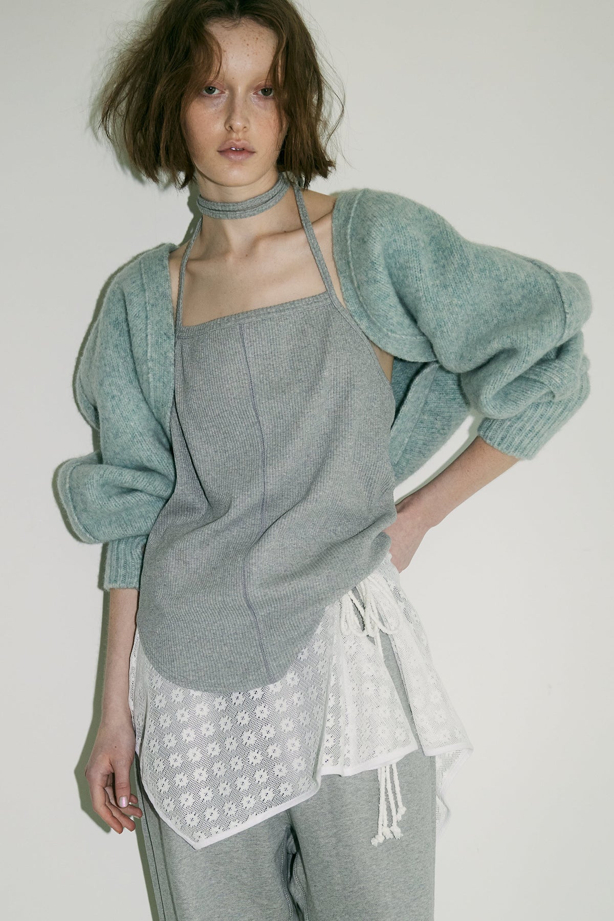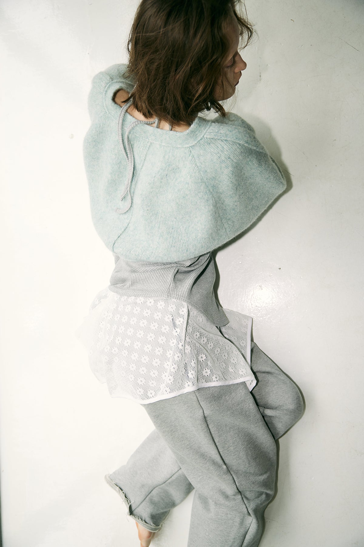 バランスの良い丸みシルエットにとことんこだわり、ダーツを細かく入れながら編んだ背中のライン、異なる素材のテープを施した袖山のラインとともに、スタイリングのアクセントになりつつも着用時にリラックスして過ごせる形を追求しました。