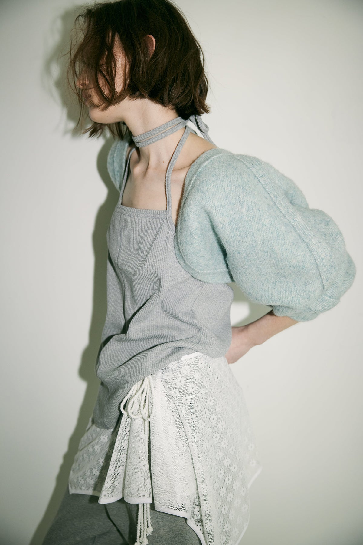 空気を含みやすいブークレー糸をいくつも編み合わせることで暖かさも格別で、モードなイメージでありながら冬のどんなスタイリングにもフィットするこのボレロは、寒さの増していく冬を快適にお過ごしいただけるアイテムです。