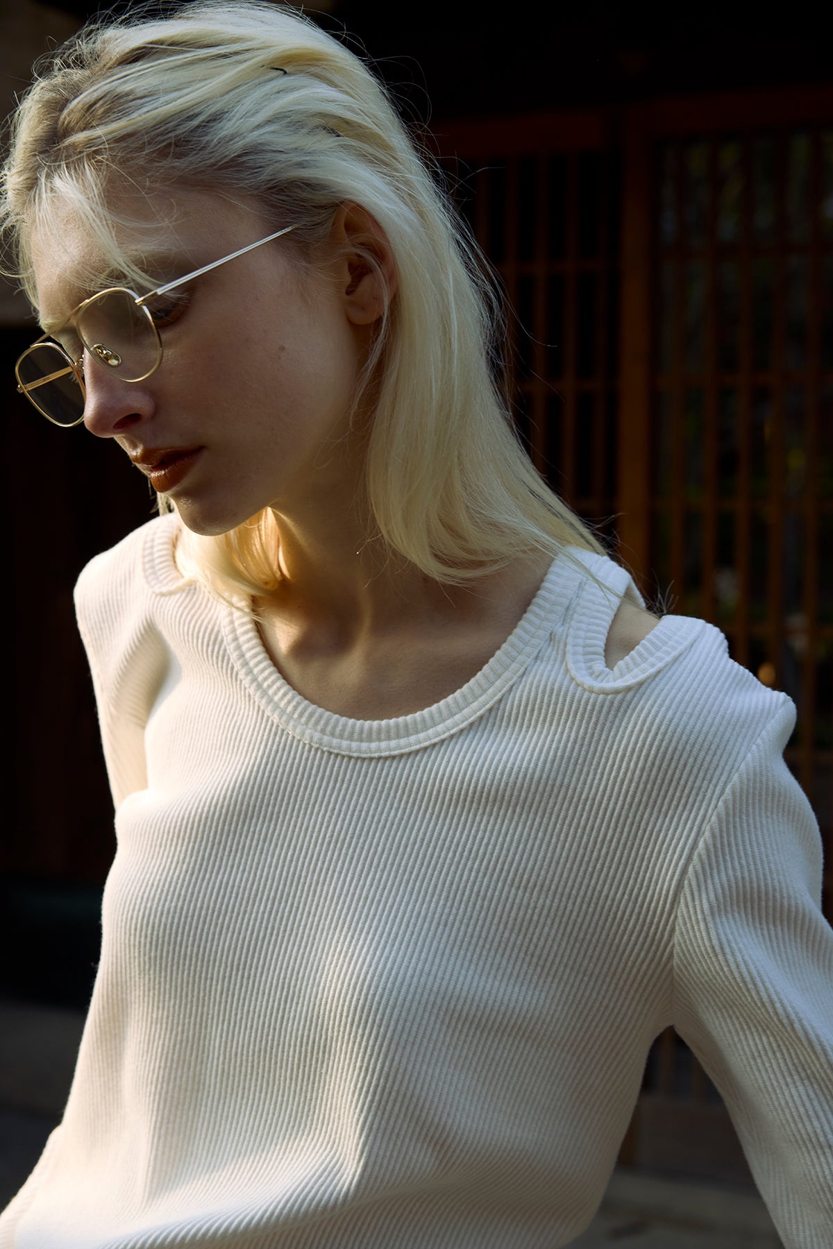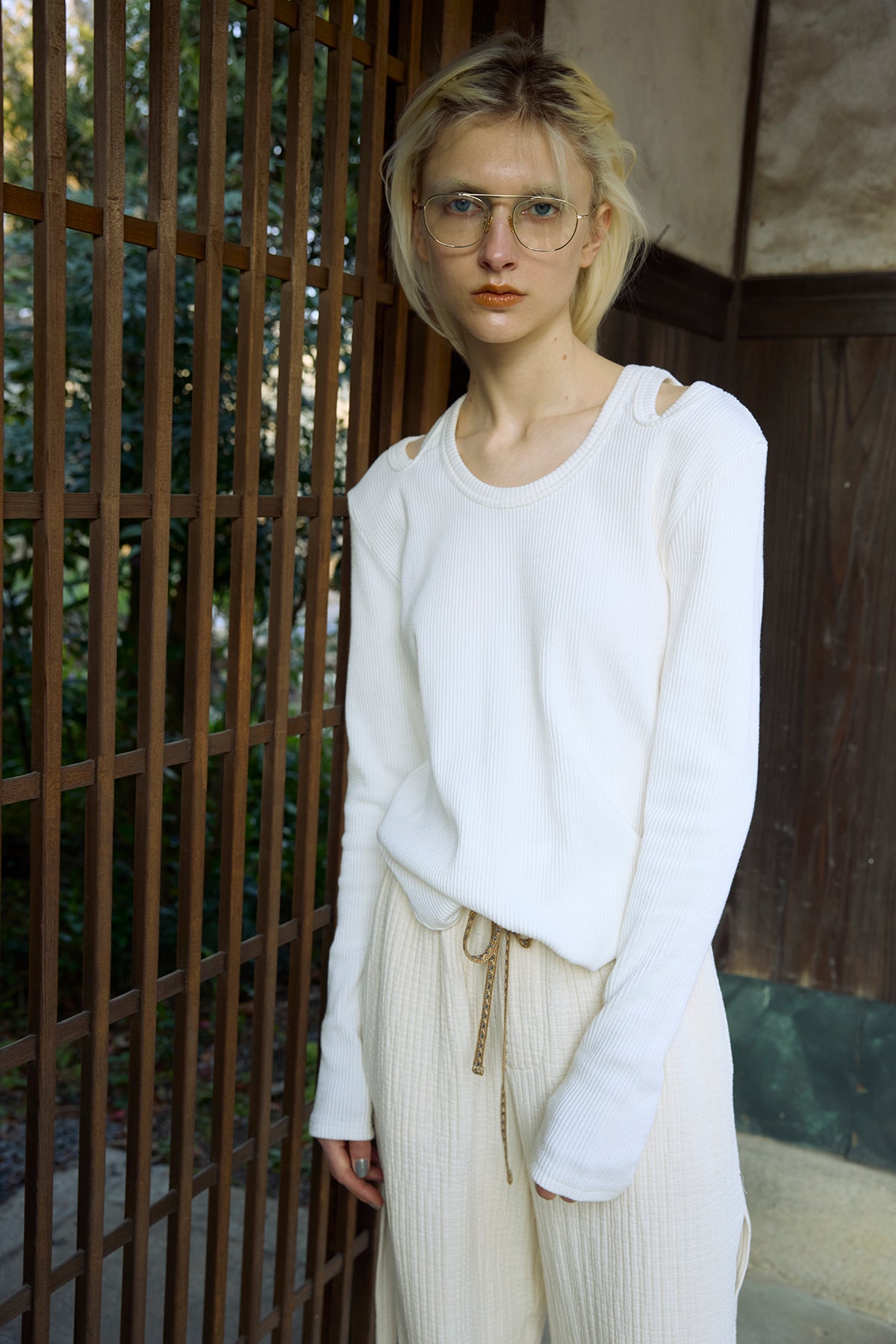 ボールドなフライスで縁取ったショルダーホールが目を引く、洗練されたデザインのリブカットソー。
