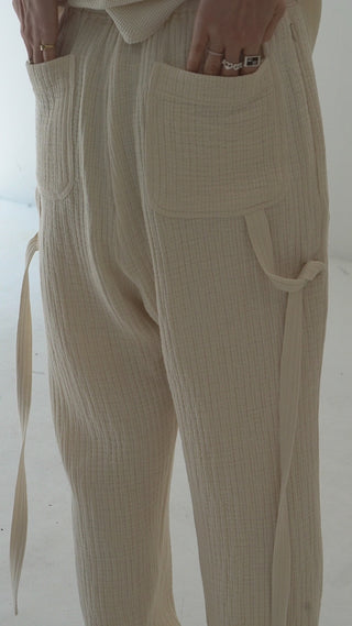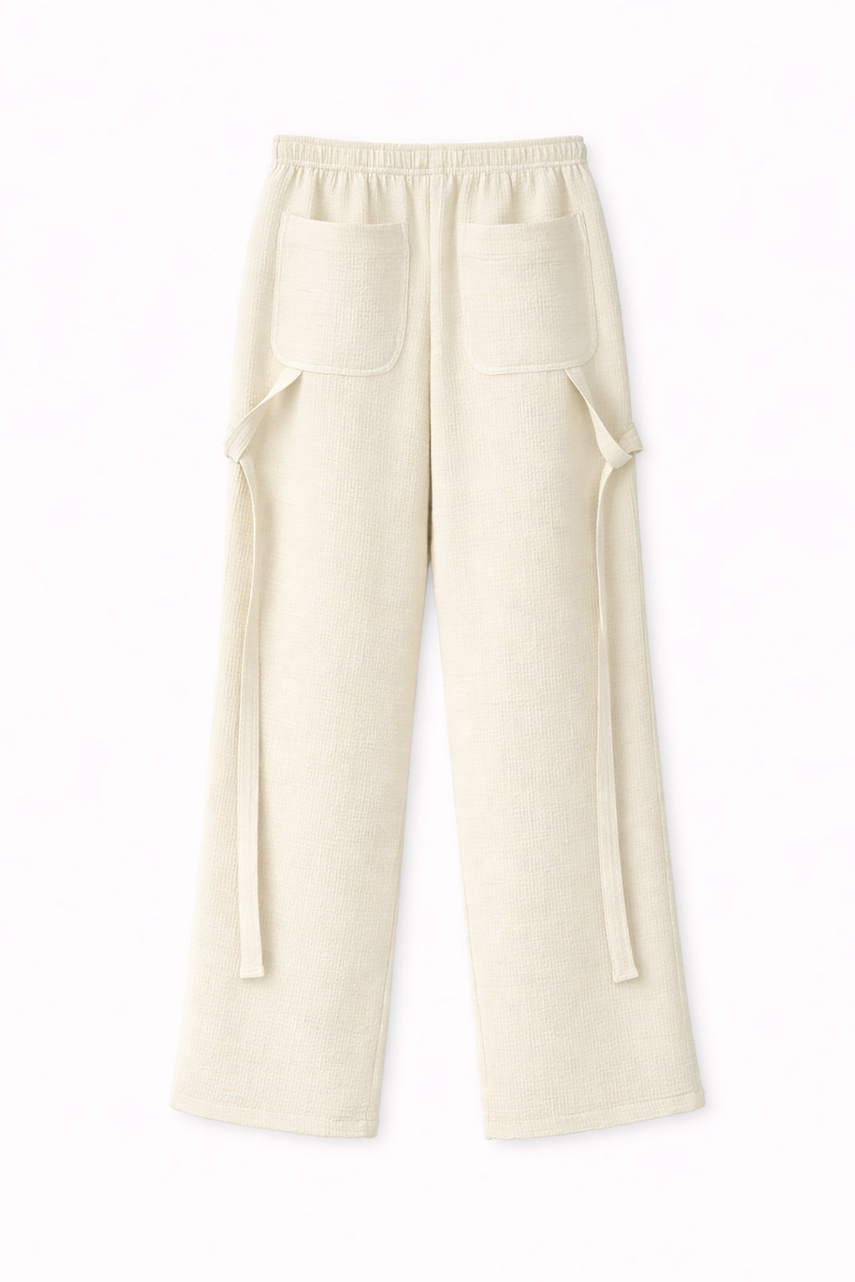 ウエストはギャザーゴム仕様の内紐タイプで、フィット感の調整が可能。